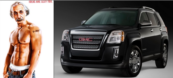 A General Motors advertisement in People Magazine‘s “Sexiest Man Alive” issue features a buff, shirtless Albert Einstein with “E=MC^2” tattooed across his formidable deltoid. The caption reads, “Ideas are sexy too.” Clearly, the gas guzzling SUV advertised on the adjacent page is at same high level of intellectual achievement as the theory of relativity, and just as hot.