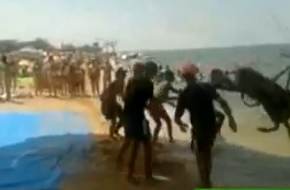 According to the BBC, the donkey landed in an "atrocious manner" after being dragged half-dead across several meters of water, terrifying children and alerting adults to call the police.