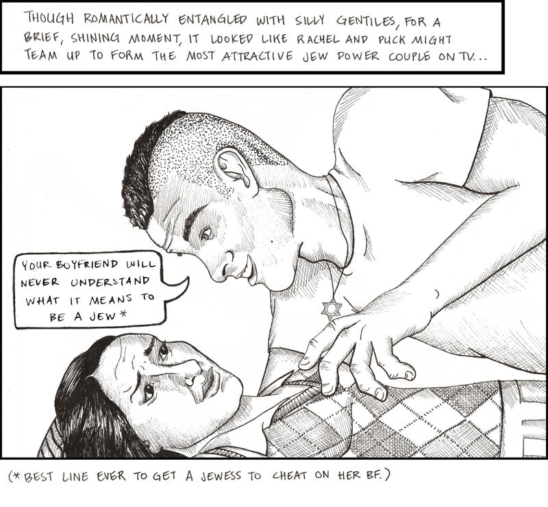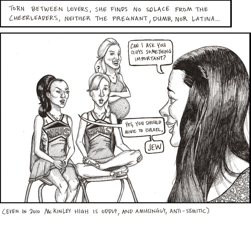 Chosen TV: An Illustrated Plea for More Jew-on-Jew Action on Glee Yael Abramowitz May 16, 2010 Archives, Culture 7 What do you think? 7 Responses The OTHER Yael May 16, 2010 Love it! Great job. :) Reply Susan Abramowitz May 17, 2010 I think the best one is of Yael’s drawing of herself. I need to watch more of GLee! Haven’t seen one in quite awhile! Reply Michael Abramowitz May 17, 2010 I think Yael’s art is great. By the way, even though we have the same last name, we never met before. P.S. Yael, Will you be home for Shavuos? Reply Mendybram May 17, 2010 Love it! The illustration is killer and the humor dry and biting – we brits love that! Reply Miriam Shaviv May 17, 2010 AMAZING illustrations. You guys have recruited some seriously talent. Reply Lhyzz May 17, 2010 Haha, nice. I was watching Glee when I read this! Reply Ash May 17, 2010 Funny, I enjoyed it. But Puck is a womanizing ass. You really want to break Rachel’s heart like that? She’d be better of trying to date Will again than going for Puck. Reply Leave a Reply Cancel Reply Your email address will not be published.CommentName* Email* Website Save my name, email, and website in this browser for the next time I comment.